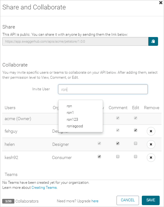 Note: Teams can be added only to organization-owned APIs. Each member of a team counts as one collaborator.