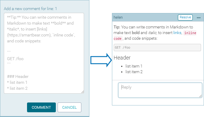 OpenAPI Code Editor supports comments, so you can share your thoughts and discuss ideas with other users. Comments are used as tickets that bring issues and ideas to the attention of other users.