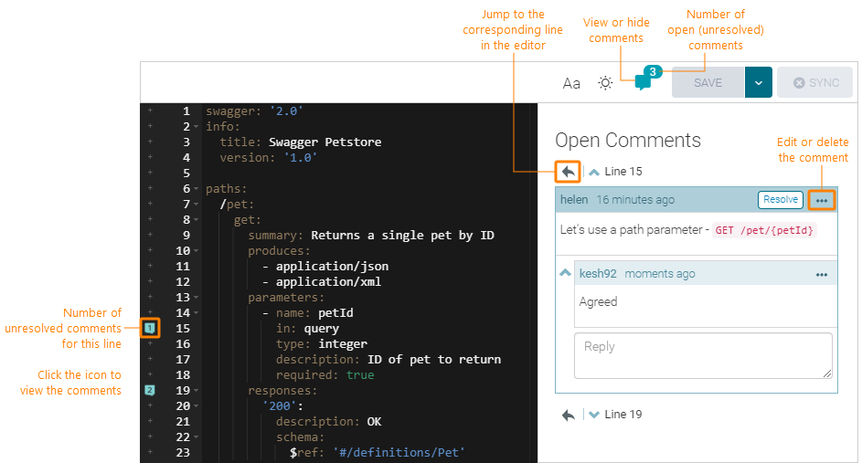 Designers and consumers can add comments on any line of the OpenAPI definition, and can also reply to, resolve, and re-open comments.