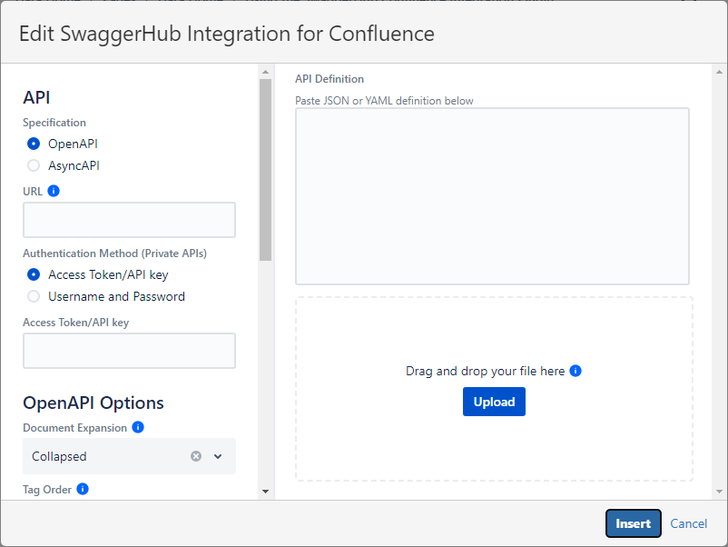 - Import the API definition into Confluence by pasting the API file into the API Definition field at the top right of the dialog OR dragging and dropping a file into the Upload area at the right – If you import in this way, you must re-import the API when you make changes.