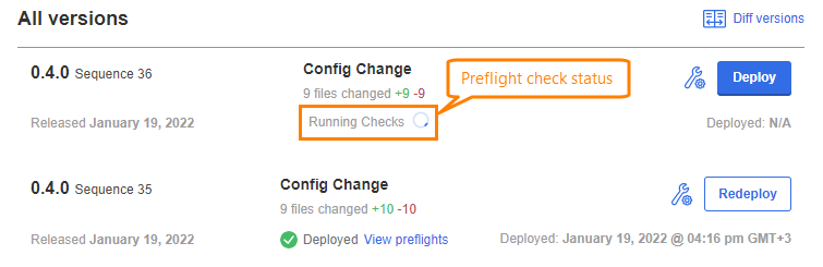 You will be redirected to the Version history page of the Admin Console. The configuration change appears as a new sequence which starts preflight checks.