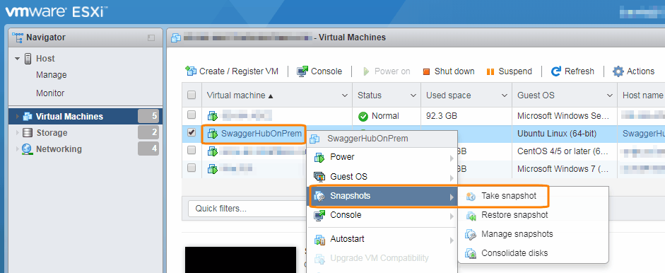 Right-click your SwaggerHub On-Premise VM and select Snapshot > Take Snapshot.