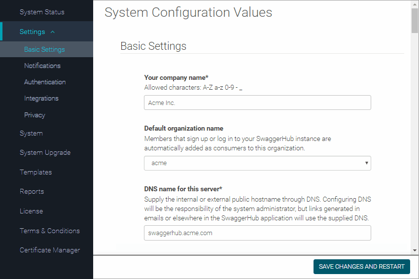 Here you can view and change the system settings of your SwaggerHub On-Premise instance: