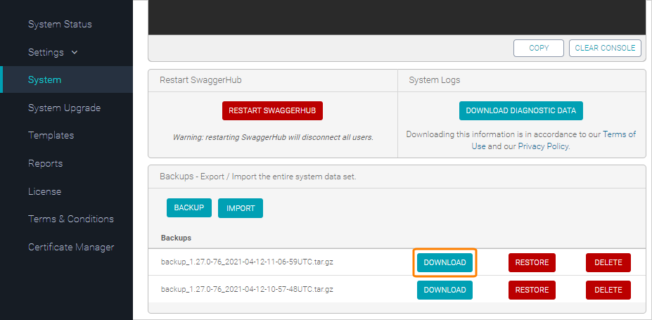 After you have downloaded the backup, shut down or stop your SwaggerHub On-Premise instance. This ensures that no new data (such as API definitions, comments, or users) is created in SwaggerHub during the migration, and that the backup has all the latest data.