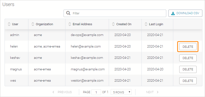 Before deleting users, make sure their API definitions, domains and organizations have been transferred to other users. Otherwise, the data will be lost. |