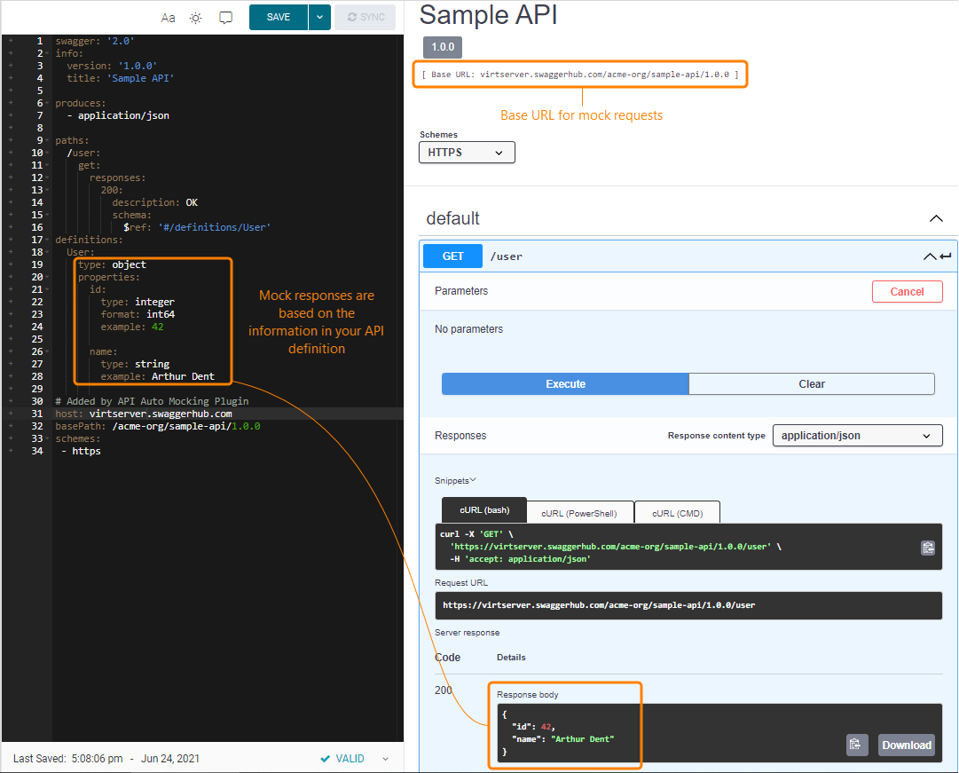 will be commented out and replaced with the mock server values:# host: api.example.com # basePath: / # schemes: # - http ... # Added by the API Auto Mocking Plugin host: virtserver.swaggerhub.com basePath: /owner-id/api-name/1.0 schemes: - https