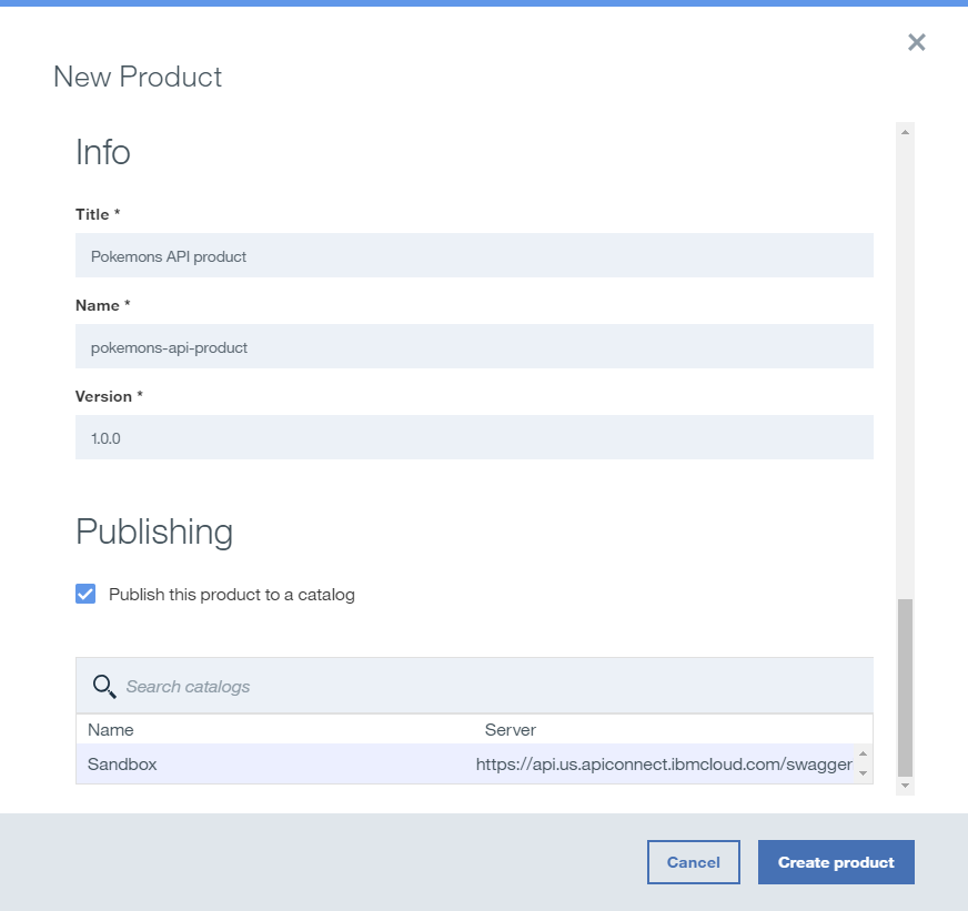 Specify the product title, name and version. Select the check box to Publish this product to a catalog and select the catalog to publish to. You should have the default catalog named Sandbox.