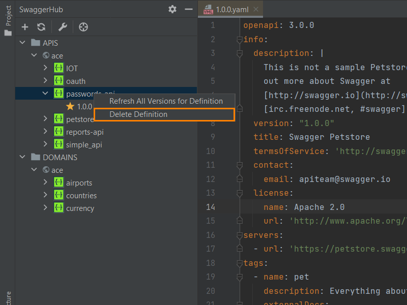 If you want to delete an API or domain, right-click the API or domain and select Delete Definition.