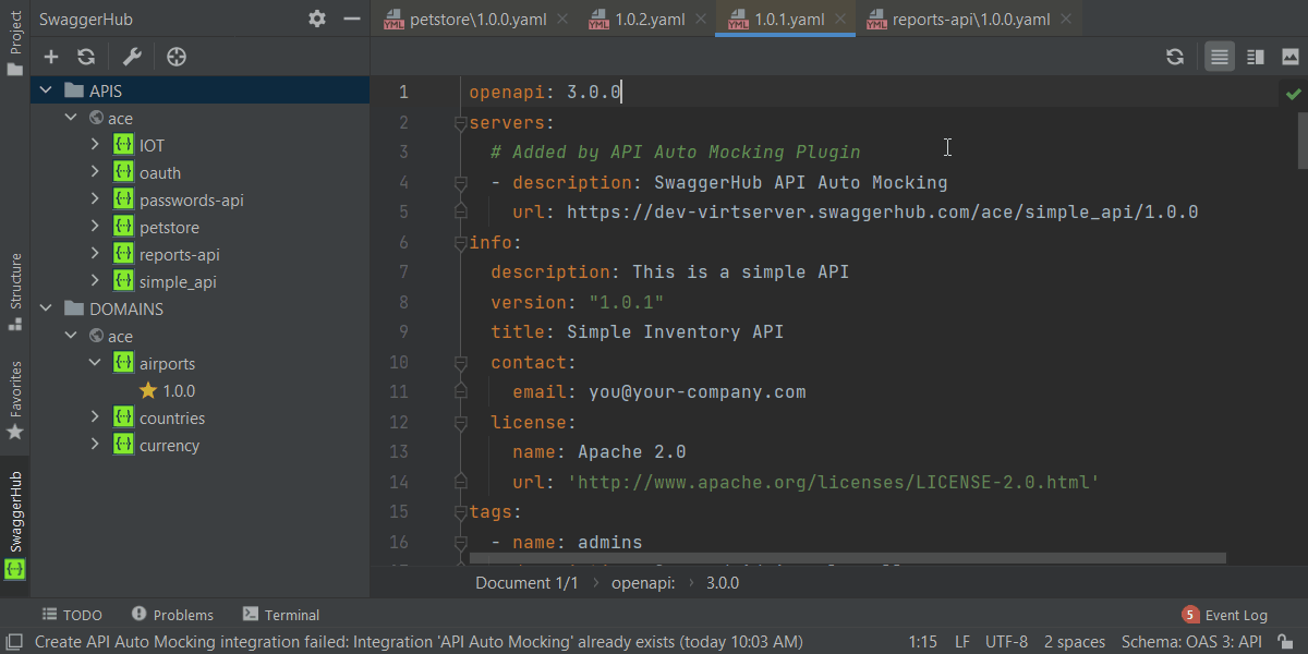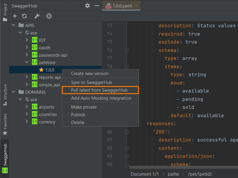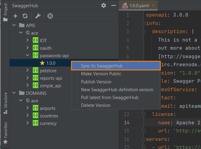 Note: | Changes made in an API or domain version and saved via Ctrl+S or File > Save All are not saved to SwaggerHub automatically. You need to right-click an API or domain version and select Sync to SwaggerHub. |