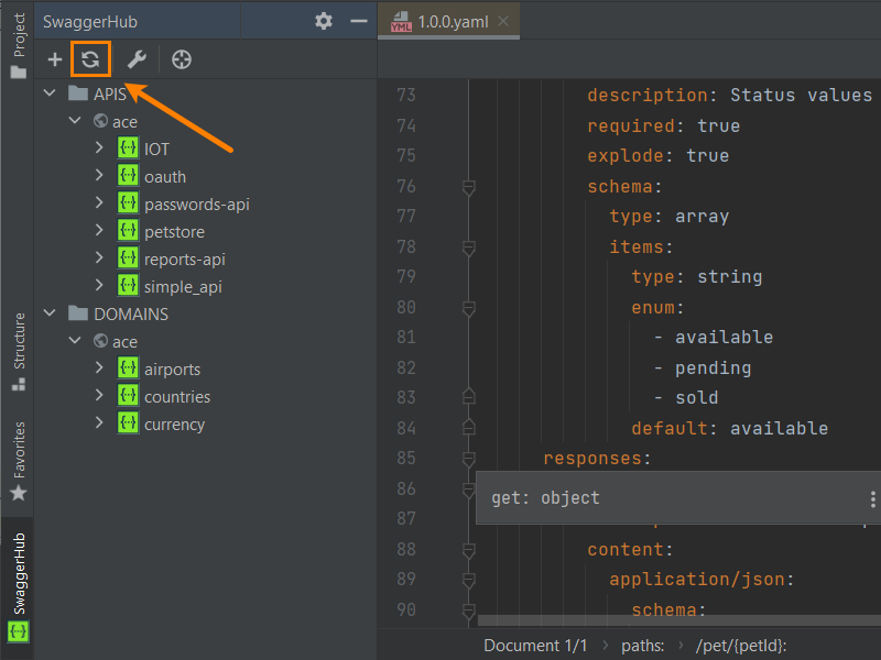 If you want to refresh an API or domain and its versions from SwaggerHub, click in the SwaggerHub panel.
