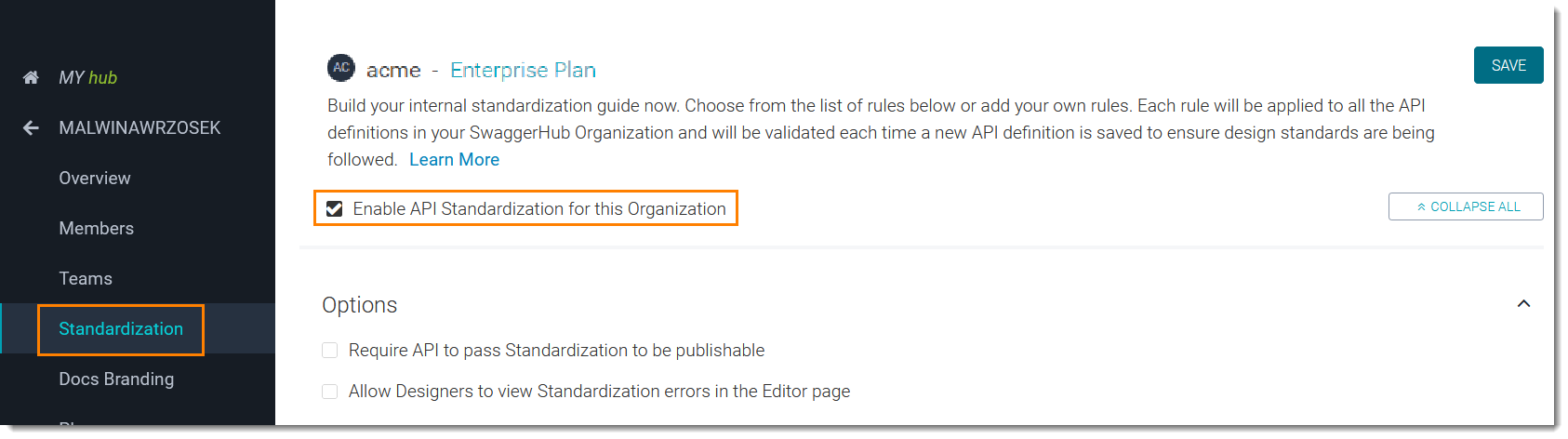 Organization owners can enable and configure API Standardization in the organization settings: