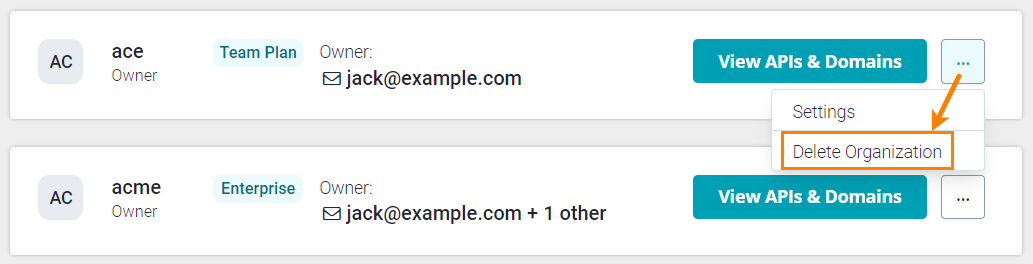 The owner of an organization can delete it. Deleting an organization deletes all APIs and domains owned by the organization. This cannot be undone.