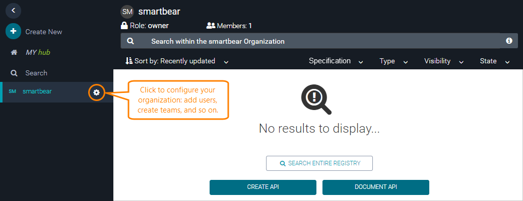 Once the organization is successfully created, you can add existing SwaggerHub users as members to the organization. To do that, click in the top right corner of the organization page.