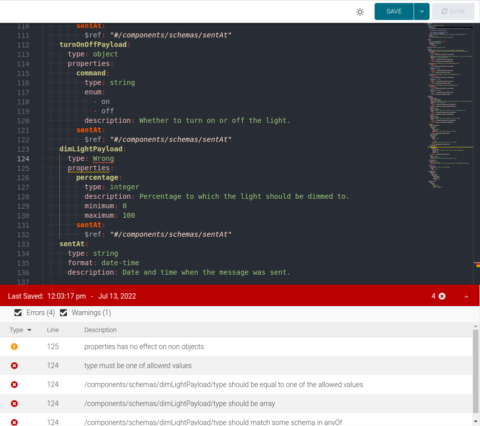 As you type, SwaggerHub automatically validates your API definition and shows any errors or warnings that might occur, such as syntax errors, unresolved references, or unused definitions. To see the error list, expand the validation bar at the bottom of the editor. Click an error message to jump to the line that triggered this error.