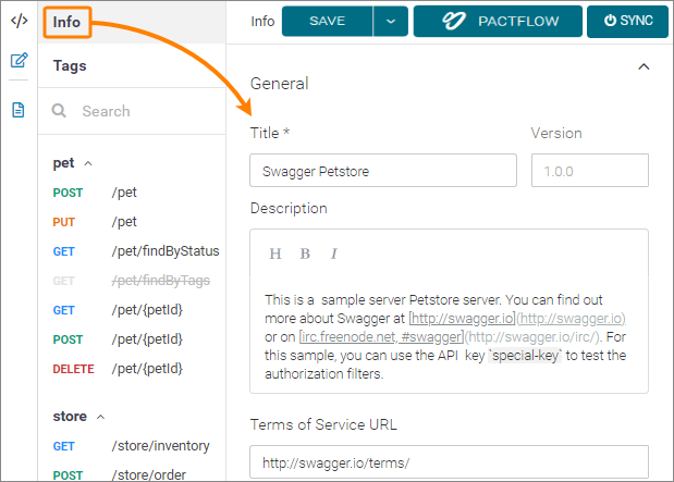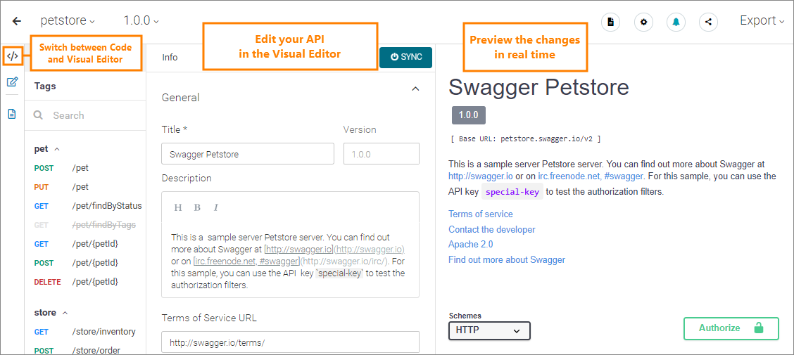 SwaggerHub provides Visual Editor for OpenAPI 2.0 and OpenAPI 3.0 definitions so that you can update your API information without having to understand the YAML syntax. Visual Editor is fully synchronized with the Code Editor. The changes you make in Visual Editor are immediately reflected in the YAML code, and vice versa.