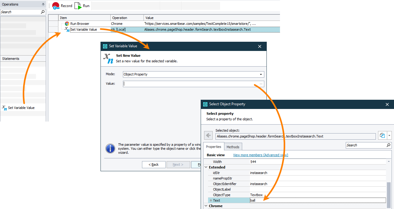 2. In your keyword test, add the Set Variable Value operation. TestComplete will open the Operation Parameter wizard.