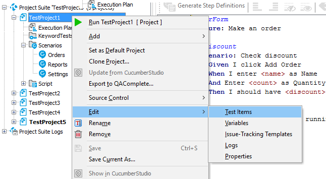 Test items help you organize the tests of your project into a test set and run them in the desired order. You can include BDD tests in test items to make them part of your project test run and execute them on a regular basis.