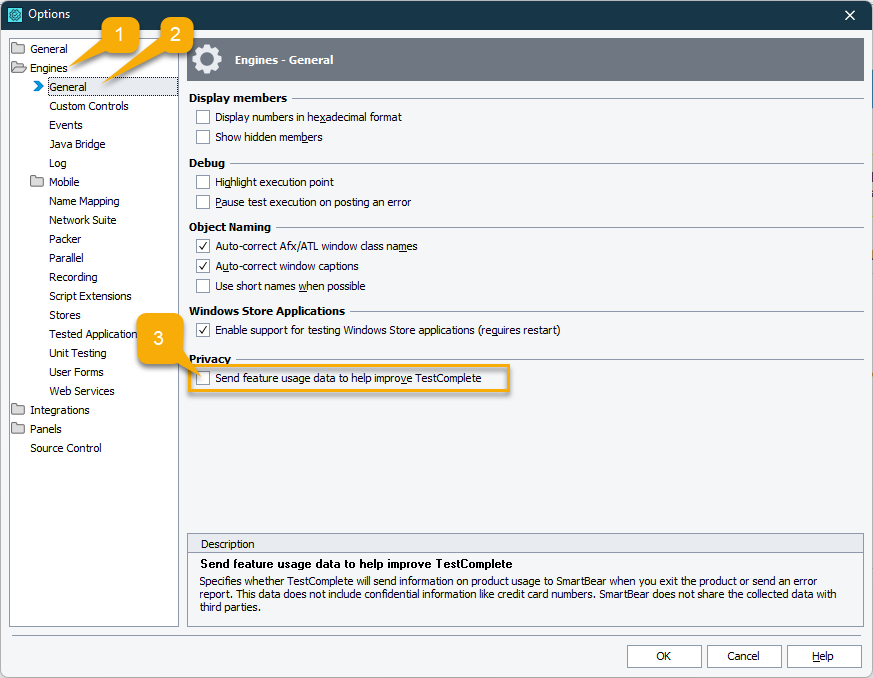 - On the right, under the Privacy section, clear the checkbox Send feature usage data to help improve TestComplete.