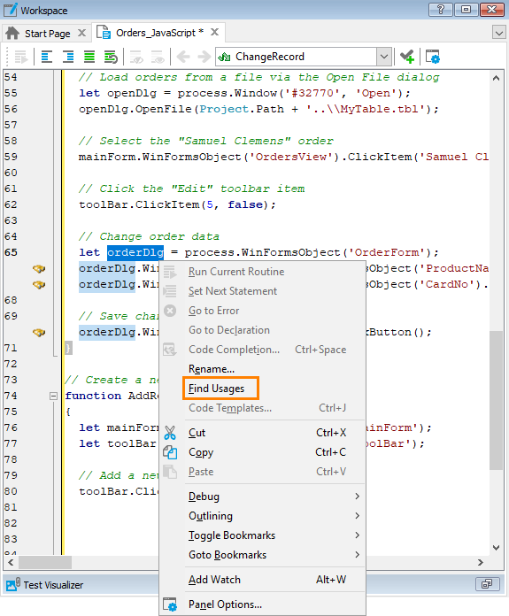 TestComplete will find all the occurrences of the selected variable, routine or object in your script units, keyword tests and project items.