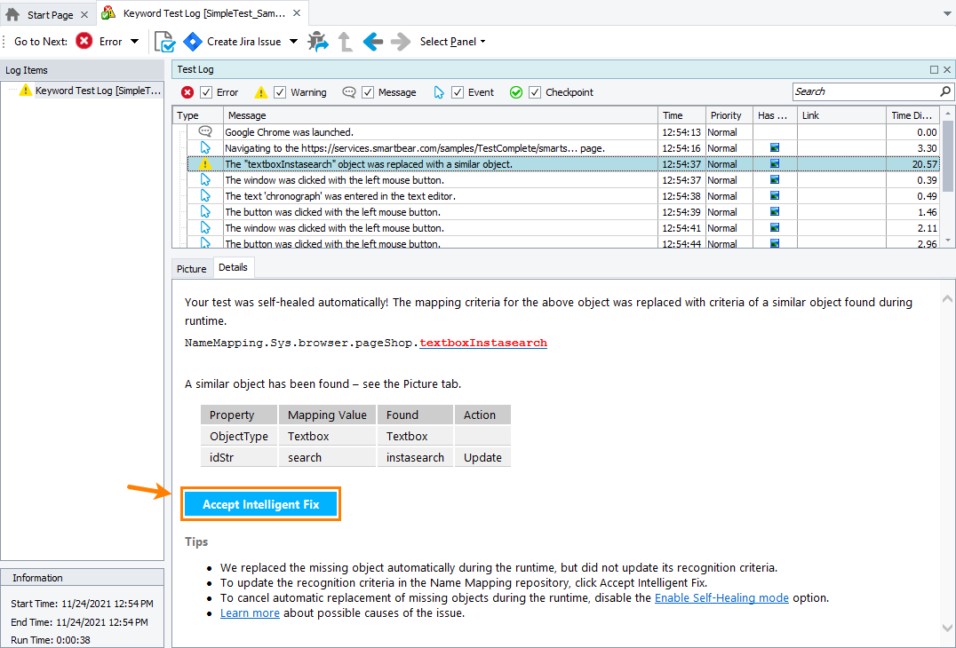 If applicable, TestComplete will try to find an object similar to the missing one. Depending on whether the self-healing mode is enabled, it either uses the replacement object to continue the test run or posts information on the replacement object to the test log. Otherwise, it will post the error message to the test log.