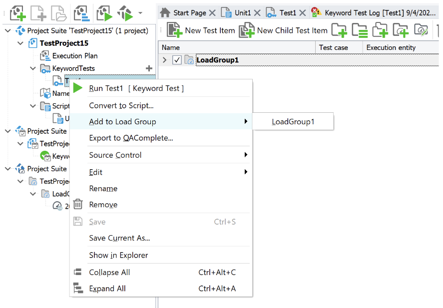 After you've created the load group, add the desired keyword or script tests (that you want to run as a load test) to this group. Right-click on the selected keyword or script test and select the "Add to Load Group" option. You can also drag the test onto the created load group.