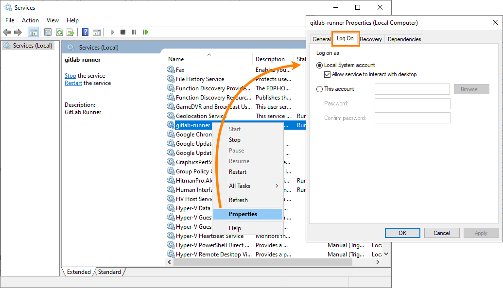 • If you use the Local System account to run the service, select the Allow service to interact with desktop checkbox.