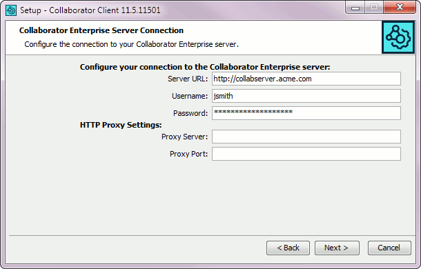 When run in unattended mode, the installer cannot verify the client's connection with the Collaborator server. You might have to manually configure the connection with the server.