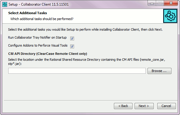 In order to enable integration with ClearCase Remote Client, you should launch client installer with administrator permissions on Windows. You need to specify the location of the Rational CM API jar files on your system. See details in Support for ClearCase Remote Client.