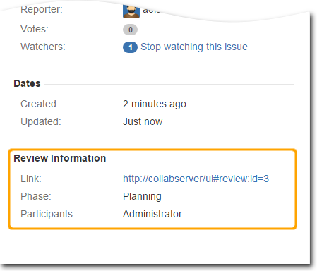 Note for JIRA 7 users: Due to technical issues, JIRA 7 cannot display the Review Information block automatically. As a workaround you can manually make the Review Id, Review Participants, Review Phase and Review Link fields be visible on your JIRA screens.
