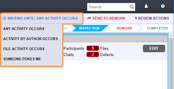 If you want to wait for certain actions to happen before finishing the review, click Wait in the header and select the appropriate option in the drop-down list.