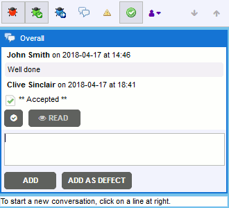 At the top of the chat pane, you will find a series of buttons that control whether or not certain types of comments appear in full or in collapsed states (to save viewing space). Note that defects, count as unread comments until they are accepted/marked read.