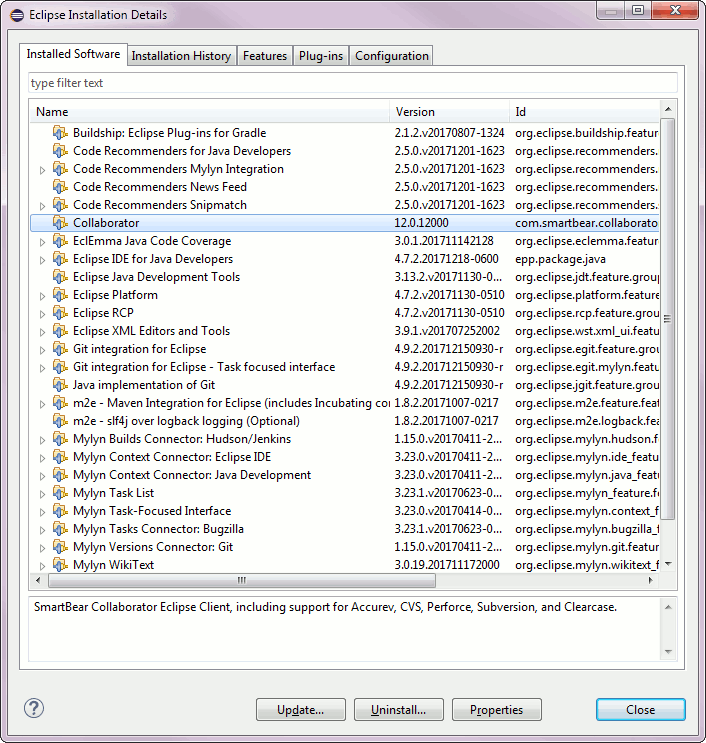 Eclipse can be configured to automatically download the Collaborator plug-in, and even to check periodically for updates. If you already know how to do this, all you will need to know is that our Eclipse update site is located here: