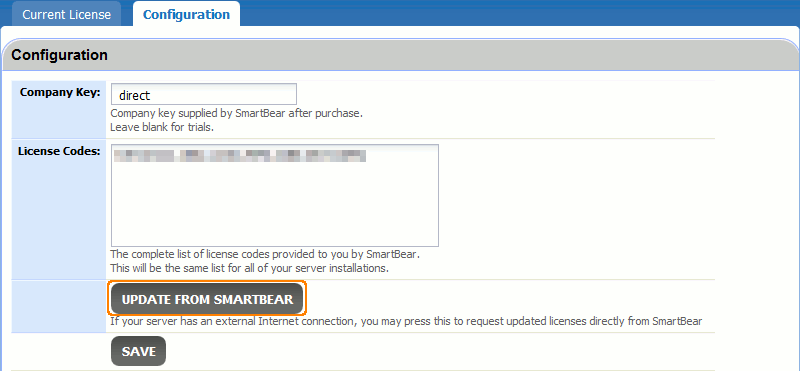 You can receive updated licenses from the SmartBear server after your initial license setup. To do this, simply click Update from SmartBear in the Configuration box.
