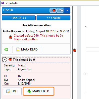 Click Mark Fixed in the defect's description in the Conversations pane.
