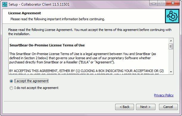 When run in unattended mode, the installer cannot verify the client's connection with the Collaborator server. You might have to manually configure the connection with the server. |