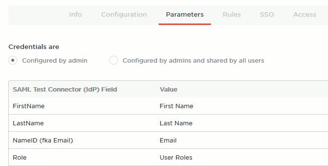 Switch to the Parameters tab. Append assertion parameters with the following with names: FirstName, LastName and Role and enable the Include in SAML assertion option for them. These parameters will respectively contain the users first name, last name, and their role (regular user or administrator).