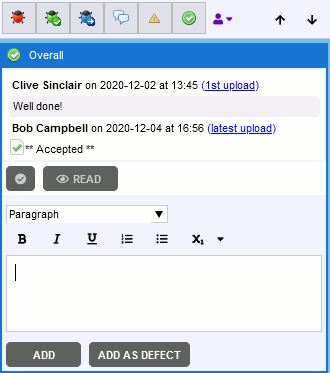At the top of the chat pane, you will find a series of buttons that control whether or not certain types of comments/defects appear in full or in collapsed states (to save viewing space). Note that defects, count as unread comments until they are accepted/marked read. The combination of these toolbar options acts as a filter of what comments/defects will be collapsed in the chat pane.