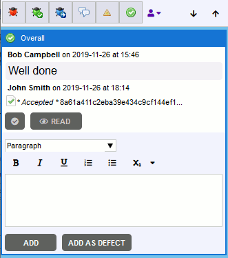At the top of the chat pane, you will find a series of buttons that control whether or not certain types of comments appear in full or in collapsed states (to save viewing space). Note that defects, count as unread comments until they are accepted/marked read.