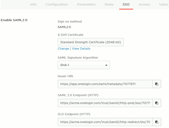 5. After you specified the values, click Save. This will create a SAML SSO configuration.