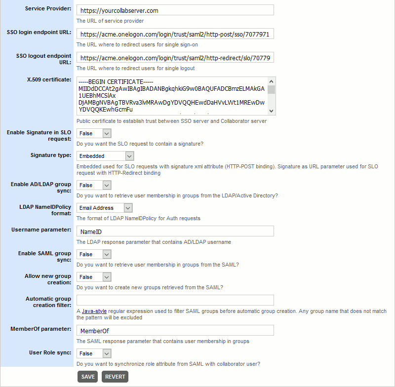 Below we describe how to establish single sign-on between Collaborator and OneLogin SSO server. Integration with Single Sign-On servers of other vendors is performed in a similar manner.