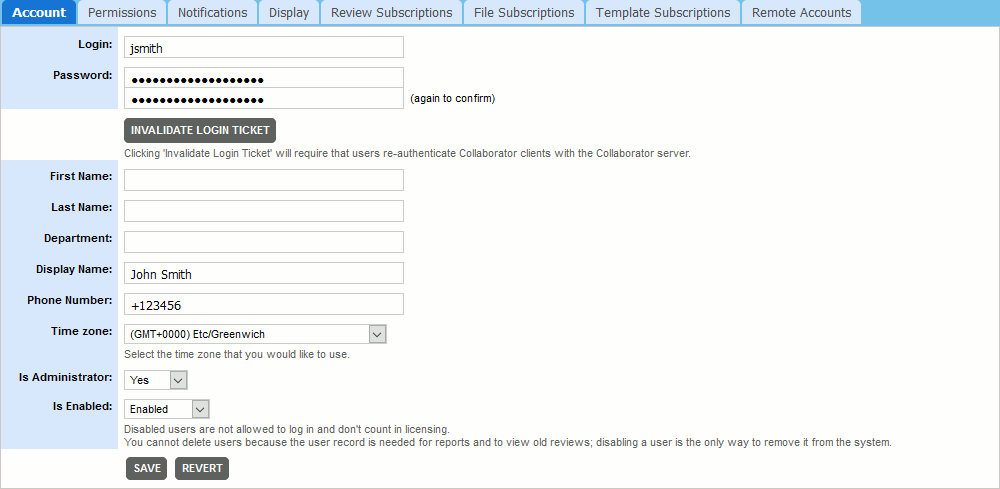 Your display name as seen by other users everywhere in the system. Up to 128 characters long. Typically, you can modify this setting yourself. However this can be disabled by Collaborator administrations, so that only administrators could modify all user display names. If you leave this field blank your login name will be used for your name. This is undesirable however; most other users will not know you by your login name. |
