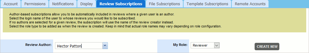 Review Subscriptions allow you to automatically subscribe and be included in reviews with a preferred author. In the Review Author field, select the login name of the user to whose reviews you would like to be subscribed. If no authors are selected for a given review, the subscription will use the name of the review creator instead - unless the review creator is flagged as a system admin. Choose your role type (Reviewer, Observer, or Moderator) in the review in the My Role field. Keep in mind that actual role names may vary depending on your role configuration.
