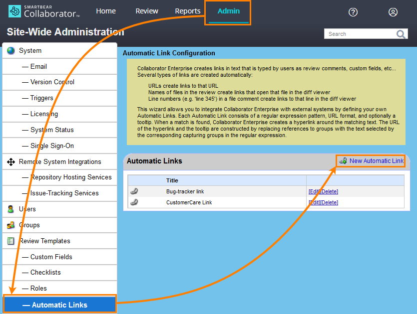 • To configure automatic links, you need administrator permissions in Collaborator.