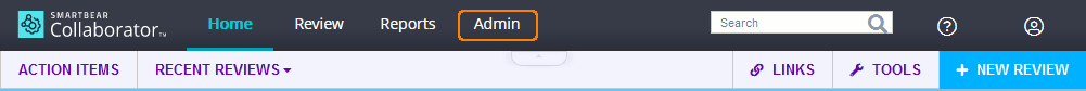 To change and view these settings, click Admin at the top menu bar of Collaborator. This button is available to Collaborator administrators and users with advanced user permissions. Administrators can modify all administrative settings, while users with advanced permissions could modify a limited number of settings depending on what permissions they have.