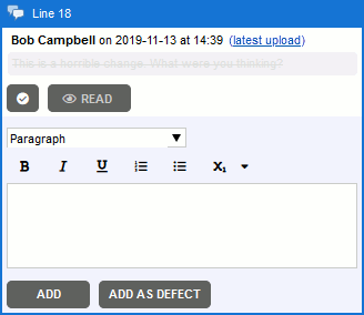 When you click Add, your message is transmitted to all other users and you have started a threaded conversation for that particular location (line, coordinates, cell). In this case, it would look something like this:
