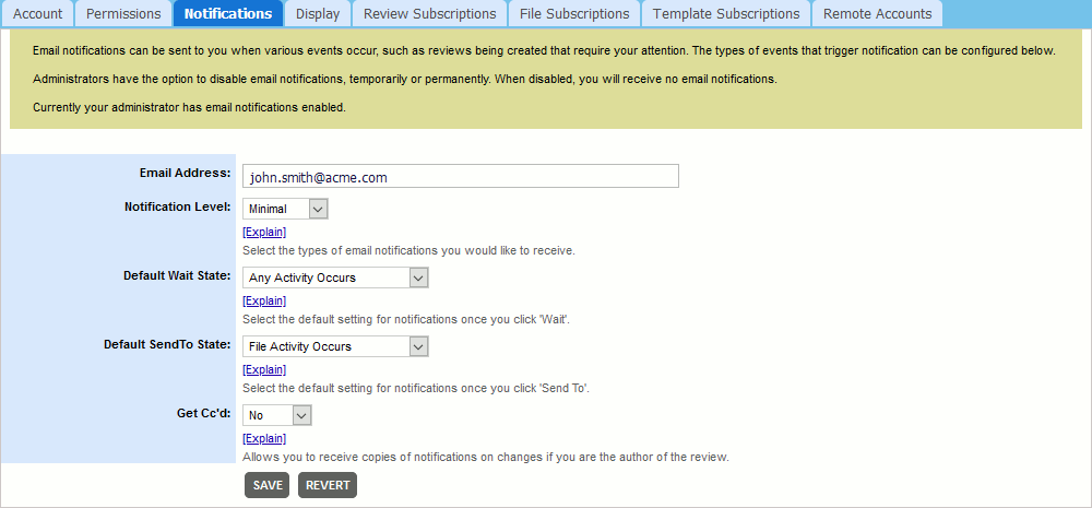 Template Subscriptions allow you to automatically subscribe and be included in reviews having a particular template. Select the name of a template you would like to subscribe to in the Review Template field and specify your desired role type (Reviewer, Observer, or Moderator) in the My Role field.
