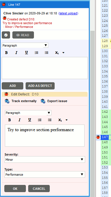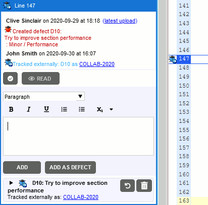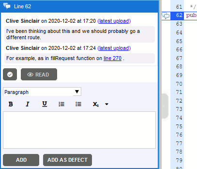 When you want to indicate that there is a problem that needs to be fixed rather than simply discussed you open a defect. Do this using the Add as defect button below the comment field: