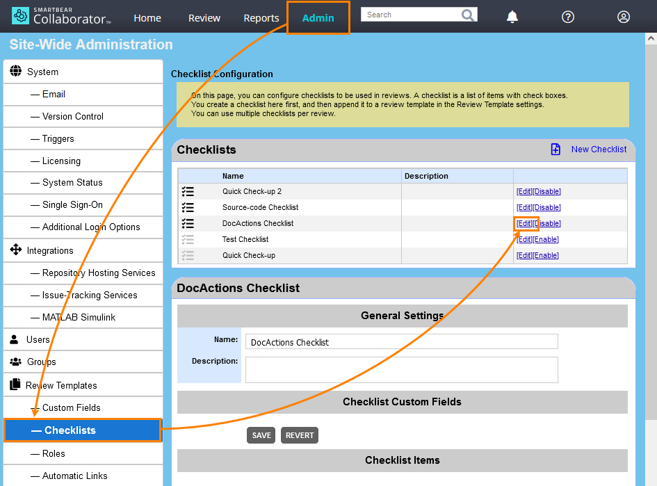 1. Go to ADMIN > Review Templates > Checklists. Find the desired checklist, if the checklist is active, then disable it, and then click Edit: