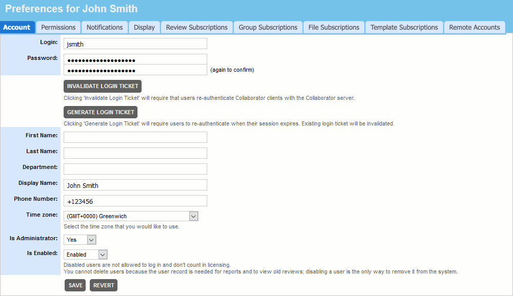 The password needed to log into the system. Can be blank for "no password," although in all cases the password will be displayed with many dots as shown in the screenshot above. This prevents the causal observer from knowing anything about your password, even its length. When changing your password you have to type it in twice to confirm. Instead of using password, you can use login ticket for authentication in Collaborator desktop clients. Login tickets are special alpha-numeric identifiers that act as user credentials for a limited time period. By default, tickets are valid for 30 days. Collaborator administrators can decrease or increase ticket's time-to-live. To obtain a ticket, press Generate Login Ticket and copy the resulting alpha-numeric identifier. Now you can specify it instead of password in Collaborator desktop clients. Generating new login ticket, invalidates any existing login tickets. To invalidate any existing login tickets, press Invalidate Login Ticket. This will cause Collaborator desktop clients to re-authenticate. |