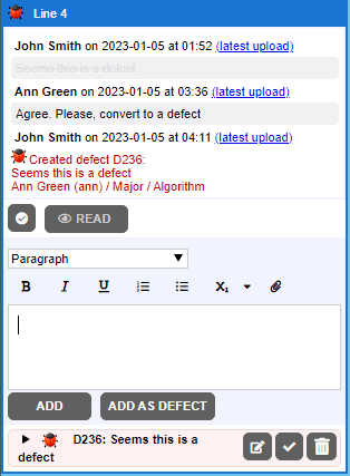 Review participants could convert only their own comments. Newly created defect is added to the end of conversation, with new date-time.
